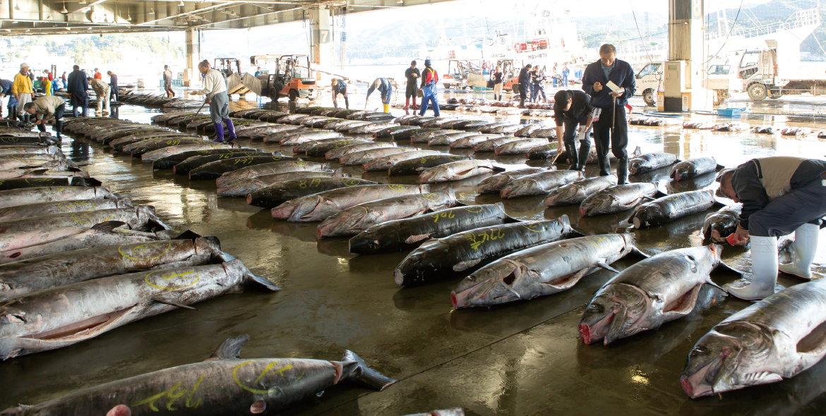 まだ、朝日が昇らない暗闇のなかで、気仙沼市魚市場はすでに活気づいています。漁船から水揚げされたメカジキは、重さを計り、品質ごとに選別して並べられます。100キロを超す大きな魚体が整然と連なる光景は、実に壮観です。